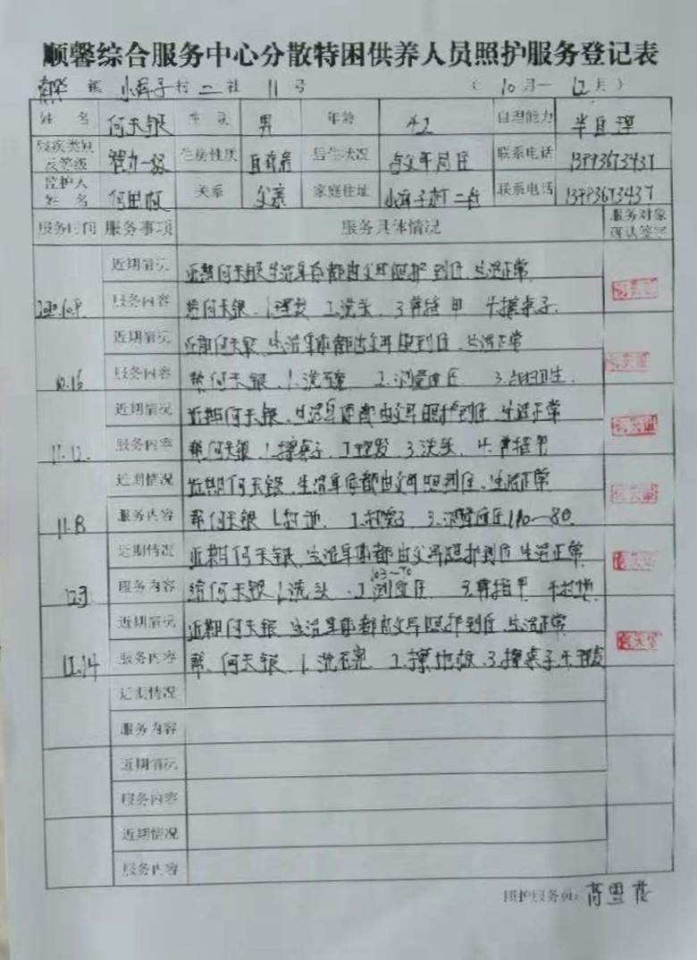 聚焦特困供养对象,实现应养尽养。严格落实定期走访探视制度,镇领导和包村干部每月探视一次,并建立走访探视台账。各镇人民政府、村委会与特困供养人员签订监护协议,靠实监护人的监护职责,对不履行或履行不到位的及时更换监护人,签订监护协议1212份。扎实推进特困供养对象照料护理工作,通过政府购买服务与高台县顺馨社会工作服务中心签订服务协议,为全县832名分散特困供养人员建立信息档案,对全自理、半自理、全护理的特困人员落实“每周搞一次卫生、每半月洗一次衣服、每月理一次发”的“菜单式服务”。筹集436.6万元为分散供养特困人员新置增添衣服鞋帽、床单被褥、锅碗瓢盆、居室辅助等27项生活必需品。同时,结合乡村振兴和村居风貌提升行动,积极动员36名住房安全有隐患、饮食起居条件差、监护责任落实不到位的分散供养对象入住县养老中心。今年以来,新增特困供养对象34户38人。