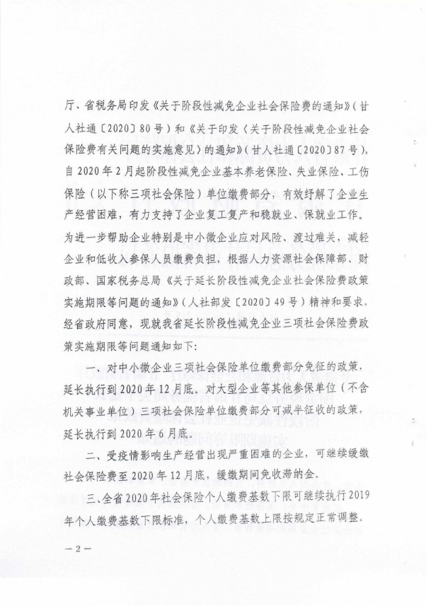 甘肃省人力资源和社会保障厅 甘肃省财政厅 国家税务总局甘肃省税务局 关于延长阶段性减免企业社会保险费政策实施期限等问题的通知