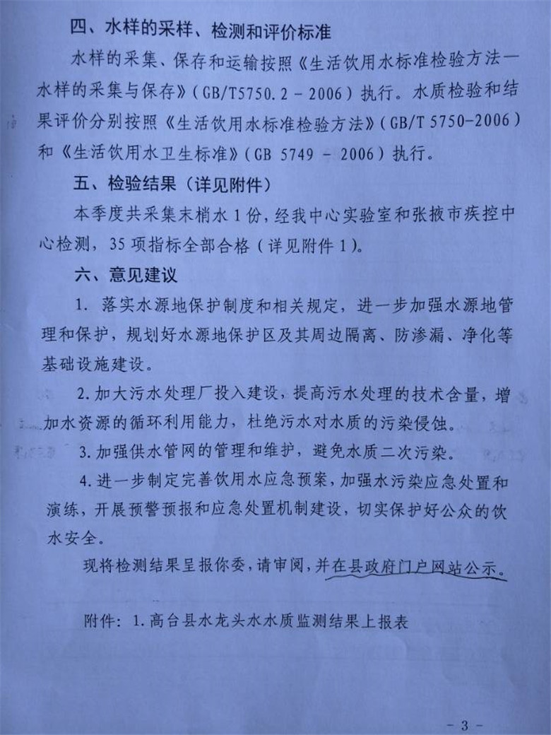 关于报送高台县2019年第四季度市政供水末梢水水质监测情况报告的报告
